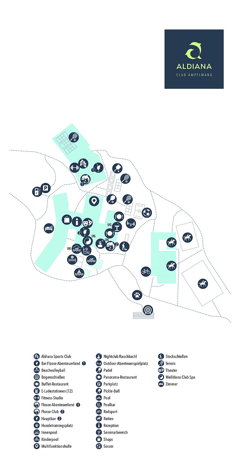 Der Aldiana Club Ampflwang ist umgeben von Wald und Wiesen, eingebettet in eine idyllische Hügellandschaft. Auf dem 450.000 qm großen Areal finden Deine Kunden eine Reitanlage mit Ponys, Criollos und Warmblütern. Anfänger bis Fortgeschrittene können hier Kurse und Ausritte buchen oder sich einfach mal in einer Kutsche durch die Landschaft chauffieren lassen. Im riesigen Indoor-Spielpark Flosse Abenteuerland kommen die Kids auf ihre Kosten. Deine sportbegeisterten Kunden kannst Du mit der Tennisanlage, einer attraktiven Bike-Station, einem Nordic-Walking- und Jogging-Parcours oder dem großen Fitness- und Indoor-Cycling Bereich überzeugen. Natürlich steht Deinen Kunden auch im Aldiana Ampflwang ein Welldiana Spa zur Verfügung, in dem man sich rundherum verwöhnen lassen kann.